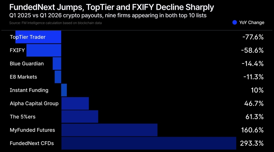 • Tracked payouts all the diagram thru the quit 10 prop companies jumped 109% year-over-year, but held flat against Q4 2025.